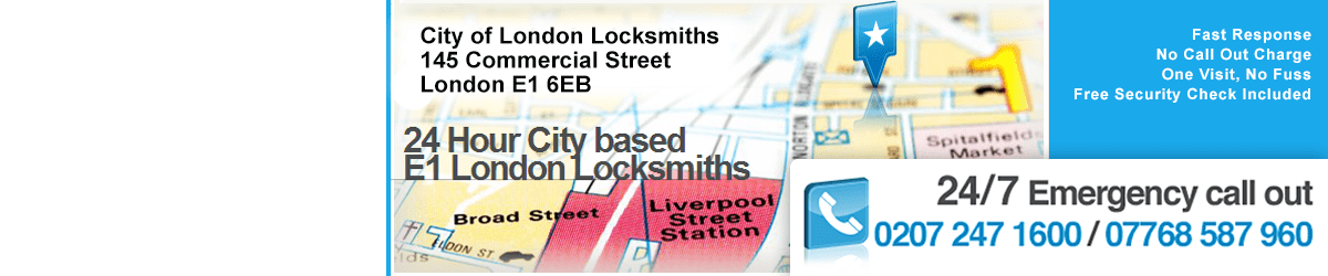 Our offices are located in Spitalfields E1, on the border of EC2, E2 and EC1, two minutes from Liverpool Street station and on the border of the City. Our mobile locksmiths in London are only 10-25 minutes away from E14, SE1, SE16, E3, E5, E8, E9, EC3, EC4, N1, N5, N16, WC1 and WC2 locations and we are available 24 hours a day, 7 days a week.